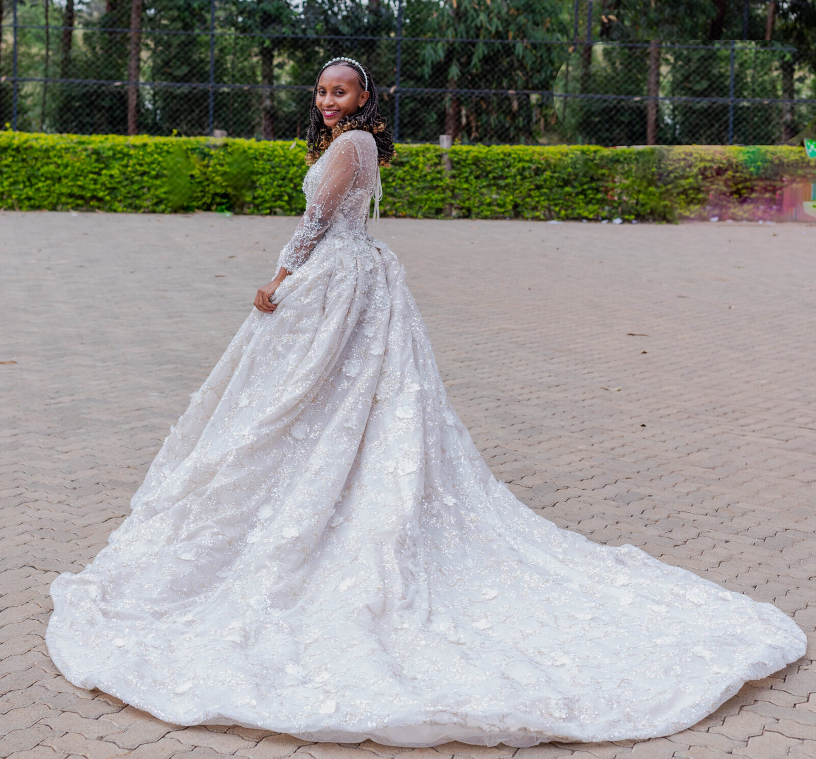 Ball gown, with embellishments (sequins & pearls), with sleeves and corset.