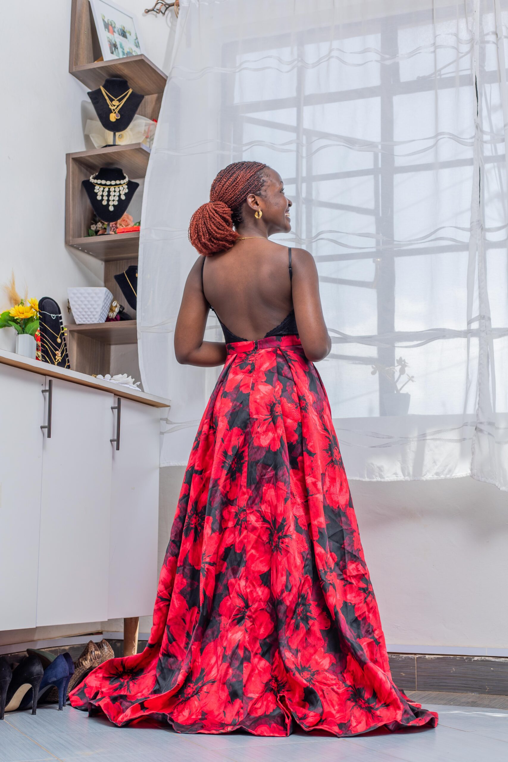 Floral satin bottom, lace top with open back