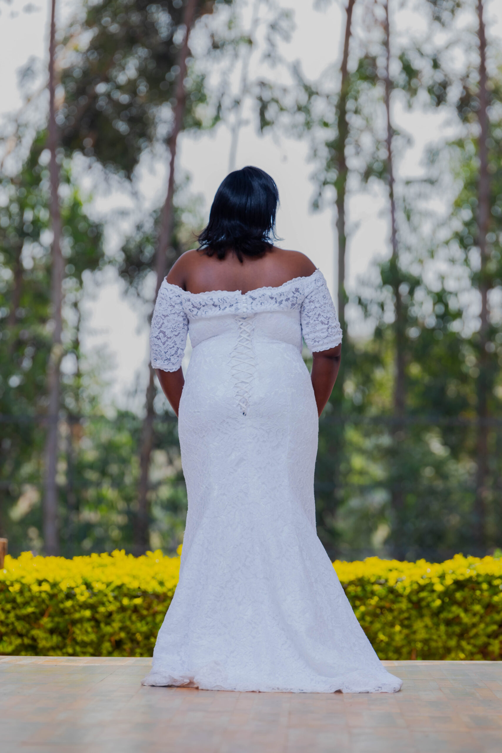 Crisp white, full lace off shoulder wedding dress with sleeves.